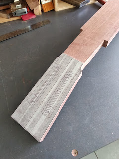 Sawn from sapele blanks and glued to form the neck, headstock and heel basic shape.